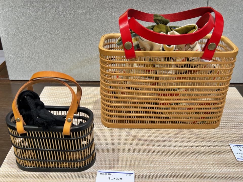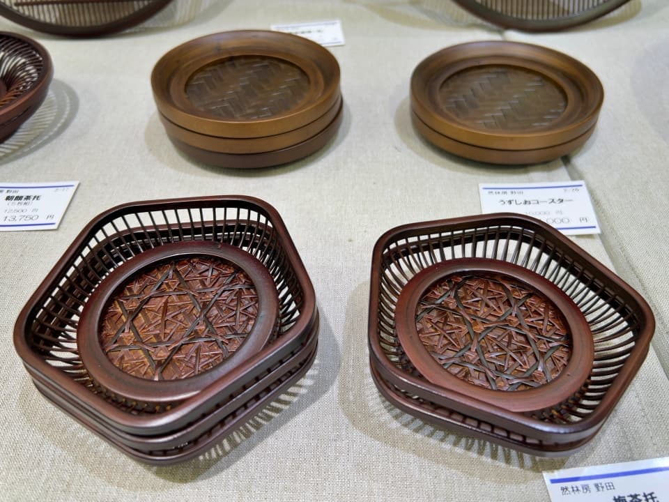 竹製の精工な虫かごや花器、藍染の雑貨製品やブラウスなどを展示紹介します。